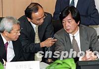 日方代表團(tuán)團(tuán)長田中均(右)七月三日在北京就中日貿(mào)易磨擦問題與中方進(jìn)行正式磋商。圖為田中均與佐野忠克等人談判前交換意見。中新社記者 鄒憲 攝