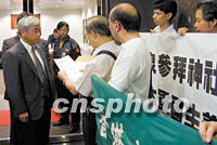 圖:香港團體游行,抗議日本首相參拜靖國神社 2001年08月15日 20:32 ![]() 香港多個團體15日舉行示威游行,抗議日本首相小泉純一郎參拜靖國神社。圖為香港教聯(lián)會向日本駐港總領事館遞交抗議信函。 中新社圖 盧峰 攝