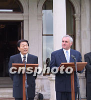 ![]() 正在愛(ài)爾蘭訪問(wèn)的中國(guó)總理朱镕基,九月三日在下榻的國(guó)賓館與愛(ài)總理埃亨舉行會(huì)談后,共同會(huì)見記者并回答提問(wèn)。中新社記者 孟慶雷 攝