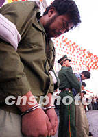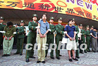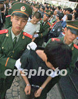 組圖:北京西城警方開展“嚴(yán)打”專項(xiàng)行動(dòng) 2001年09月20日 15:06 ![]() 袁存敏等七名盜竊、搶劫犯罪嫌疑人,二十日在北京萬通商場(chǎng)前,被西城公安局公開逮捕。警方在人員密集地段進(jìn)行公開宣判,以威懾犯罪分子、增強(qiáng)市民防范意識(shí)。中新社記者 宋吉河 攝  ![]() 北京公安西城分局二十日公開逮捕七名犯罪嫌疑人,并對(duì)三名違法人員依法勞動(dòng)教養(yǎng)。該局在“嚴(yán)打”行動(dòng)中破獲各類刑事案件1531起、抓獲各類犯罪嫌疑人2058名、收容“三無”人員15110人次。中新社記者 宋吉河 攝