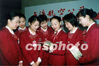 圖:上海航空公司乘務(wù)員學(xué)英語迎APEC 2001年09月26日 10:12 ![]() 上海航空公司乘務(wù)部把迎APEC會(huì)議英語100句列入日常服務(wù)英語訓(xùn)練之中,以充實(shí)服務(wù)英語的內(nèi)容,提高空中服務(wù)人員的口語水平。圖為航班準(zhǔn)備前空隙,乘務(wù)員在閱讀交流。中新社圖 夏本建 攝 |
