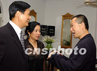 ![]() 澳門政府4日邀請香港巨星周潤發(fā)出席"第十五屆澳門國際音樂節(jié)"中的臥虎藏龍音樂會,澳門文化局局長何麗鉆向發(fā)仔贈(zèng)送紀(jì)念品。中新社圖 任晨鳴 攝 ![]() 專程到澳門出席 "第十五屆澳門國際音樂節(jié)"臥虎藏龍音樂會的香港巨星周潤發(fā)和夫人,4日與奧斯卡金像獎(jiǎng)得主、著名指揮家譚盾在澳門喜相逢。中新社圖 任晨鳴 攝