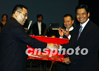 組圖:周潤發(fā)出席澳門國際音樂節(jié) 2001年10月05日 18:57 ![]() 由奧斯卡金像獎(jiǎng)獲得者譚盾(右一)指揮、由多名國際音樂家和上海交響樂團(tuán)演出的"臥虎藏龍"音樂會,4日晚在"第十五屆澳門國際音樂節(jié)"演出成功后,周潤發(fā)向音樂家表示祝賀。中新社圖 任晨鳴 攝 ![]() 香港巨星周潤發(fā)4日到澳門出席"第十五屆澳門國際音樂節(jié)"中的"臥虎藏龍"音樂會后,澳門特區(qū)政府社會文化司司長崔世安向周潤發(fā)頒發(fā)紀(jì)念品。中新社圖 任晨鳴 攝