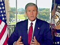 圖:布什發(fā)表講話宣布對(duì)阿富汗發(fā)動(dòng)軍事進(jìn)攻 2001年10月08日 10:45 ![]() 北京時(shí)間八日凌晨一時(shí)左右,美國總統(tǒng)布什在白宮官邸發(fā)表電視講話,宣布美國和英國已經(jīng)開始對(duì)阿富汗塔利班當(dāng)局軍事目標(biāo)和伊斯蘭極端主義份子拉登的卡達(dá)訓(xùn)練營進(jìn)行軍事打擊。  |