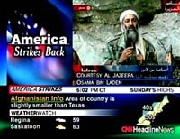 圖:美國電視節(jié)目中的本·拉登 2001年10月08日 10:57 ![]() 美軍協(xié)同英軍開始對阿富汗境內(nèi)恐怖組織訓(xùn)練營以及塔利班政權(quán)的軍事設(shè)施展開軍事打擊。其后不久,卡塔爾一家電視臺首先播放了本·拉登講話的錄像。拉登說:“我對真主起誓,除非巴勒斯坦人民能夠享受到和平,否則美國人將永遠不知和平為何物!泵绹芯電視網(wǎng)(CNN)在其黃金時間的節(jié)目中,反復(fù)播放拉登的錄相,提醒人們警惕新的恐怖報復(fù)行動。  |