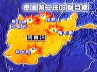 圖文:美英聯(lián)軍對阿富汗目標實施第二輪空中打擊 2001年10月09日 00:33 ![]() 阿富汗當?shù)貢r間八日二十時二十八分左右,美英開始對阿富汗進行新一輪打擊,圖為美英新二輪打擊目標的示意圖。  ![]() 阿富汗當?shù)貢r間八日二十時二十八分左右,美英開始對阿富汗進行新一輪打擊,圖為導彈擊中目標的場面。