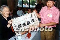 圖:辛亥革命后人給長樂市村民送當(dāng)年實物 2001年10月12日 18:15 ![]() 辛亥革命老人、孫中山先生秘書黃展云的女兒黃以雍,十一日以九十三歲的高齡專程赴長樂市,為其父于一九二七年創(chuàng)辦的“營前模范村”后人林泉送上父親當(dāng)年親筆提寫的匾額。中新社圖 陳勇 攝 |