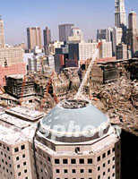 圖:紐約世貿(mào)中心斷垣殘壁 2001年10月13日 11:35 ![]() 采訪者近日從曼哈頓高處鳥瞰紐約世貿(mào)中心一號樓和周邊建筑廢墟,前面圓頂樓為世界金融中心,美林、運通、李門兄弟等著名金融公司就設(shè)在這里。“九一一”恐怖襲擊前,金融中心有天橋與世貿(mào)中心相連,“九一一”時天橋坍塌,樓頂現(xiàn)布滿建筑破損物。中新社圖 龔文謨 攝  |