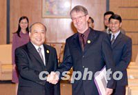 圖:石廣生會見新西蘭貿(mào)易談判部長 2001年10月16日 16:36 ![]() 中國對外經(jīng)濟貿(mào)易合作部長石廣生(左)十六日在上海國際會議中心會見前來參加亞太經(jīng)合組織(APEC)會議的新西蘭貿(mào)易談判部長吉姆·薩頓。中新社記者 毛建軍 攝 |