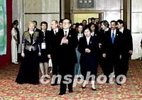 圖:江澤民夫婦舉行歡迎晚宴 2001年10月21日 11:37 ![]() 10月20日,中國國家主席江澤民和夫人王冶坪在上海國際會議中心為參加2001年亞太經(jīng)合組織(APEC)領導人非正式會議的領導人和配偶舉行歡迎晚宴。這是江澤民主席夫婦和貴賓步入宴會大廳。中新社圖 |