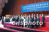 圖:中國加入WTO簽字儀式現(xiàn)場 2001年11月12日 02:43 ![]() 中國加入WTO簽字儀式于北京時(shí)間12日凌晨在多哈舉行,圖為簽字現(xiàn)場。中新社記者 錢興強(qiáng) 攝  |