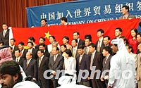 圖:中國代表團(tuán)成員在國旗前留念 2001年11月12日 02:46 ![]() 北京時間12日中國代表團(tuán)成員在多哈展示中國國旗,慶祝中國入世。中新社記者 錢興強 攝  |