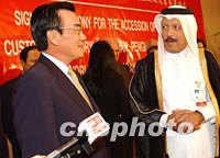 圖:WTO總干事對中國臺北加入世貿(mào)組織表示祝賀 2001年11月13日 10:08 ![]() 第四屆WTO部長級會議十二日在多哈舉行中國臺北加入世貿(mào)組織議定書簽字儀式。圖為會議主席卡塔爾財(cái)政、經(jīng)濟(jì)和貿(mào)易大臣卡邁爾,WTO總干事穆爾等向臺北代表團(tuán)團(tuán)長林信義表示祝賀。中新社記者 錢興強(qiáng) 攝 |
