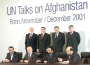 圖文:波恩會談結束 阿富汗四方簽署分權協(xié)議 2001年12月05日 19:45 ![]() 四方代表簽署協(xié)議 中新網(wǎng)北京12月5日消息:阿富汗4方代表于當?shù)貢r間5日上10時10分,在波恩附近的彼得斯貝格賓館簽署了關于成立阿富汗臨時政府的協(xié)議,波恩會談在近9天馬拉松式的談判后終于落下帷幕。 根據(jù)協(xié)議,阿富汗南部普什圖族領導人薩耶德·哈米德·考爾紹伊將出任臨時行政當局主席一職,北方聯(lián)盟則占據(jù)了臨時行政當局中負責內政、外交和國防等事務的關鍵職位。臨時政府由29名成員組成,本月22日起運作,任期6個月。 考爾紹伊曾在20世紀90年代出任過阿富汗副外長,他目前正在阿富汗坎大哈市附近指揮部隊與塔利班士兵作戰(zhàn)。 德國總理施羅德說,協(xié)議的達成顯示國際社會有勇氣和能力解決所面臨的復雜問題,他希望會談各方能夠切實履行所達成的協(xié)議。他說,協(xié)議為阿富汗重建創(chuàng)造了必要的前提,德國將和其他歐盟國家一道,為阿富汗戰(zhàn)后重建提供“實質性”的幫助。 在多方壓力下,參加阿富汗問題會談的各方代表經(jīng)過4日晚通宵達旦的艱苦談判,終于在5日清晨就組成臨時政府的人選問題取得一致,從而為協(xié)議的最終簽署鋪平了道路。  |