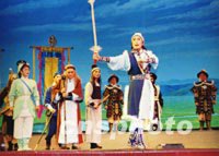 圖:金庸小說《射雕英雄傳》搬上京劇舞臺 2001年12月11日 17:27 ![]() 武漢市京劇團(tuán)根據(jù)金庸的武俠小說《射雕英雄傳》改編而成的同名京劇,十二月十日晚在南京大行宮會堂成功上演,成為第三屆中國京劇節(jié)唯一的一臺武俠劇。原著中描寫高深莫測的武功借助京劇中的“出手”及現(xiàn)代特技,得到了較好表現(xiàn)。中新社圖 劉小楚 攝  |