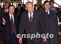 董建華抵達(dá)北京述職 將與江澤民等領(lǐng)導(dǎo)人會(huì)面 2001年12月19日 13:04 ![]() 前來北京述職的香港特別行政區(qū)行政長(zhǎng)官董建華十九日中午抵達(dá)北京港澳中心并接受記者訪問時(shí)說:“為香港真正做點(diǎn)事是我的目標(biāo)”。中新社記者 毛建軍 攝 ![]() 前來北京述職的香港特別行政區(qū)行政長(zhǎng)官董建華十九日中午抵達(dá)下榻的北京港澳中心,受到國(guó)務(wù)院港澳辦公室副主任陳佐洱(左一)等人的迎接。中新社記者 毛建軍 攝