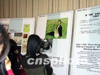 圖:中國留美學(xué)生觀看揭露邪教"法輪功"圖片展 2002年01月16日 17:05 ![]() 美國時間十五日晚,一個揭露“法輪功”邪教本質(zhì)的圖片展在中國駐美使館為留學(xué)人員舉行的新年招待會上展出,幾名女留學(xué)生站在去年一月二十三日在天安門廣場上自焚的陳果圖像前,扼腕痛惜。中新社記者 徐德金 攝 |