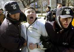 布什來訪前韓民間團(tuán)體警告美國不要強(qiáng)售戰(zhàn)機(jī)(圖) 2002年02月19日 15:00 ![]() 一名抗議布什訪問的韓國學(xué)生被警察帶走 中新網(wǎng)北京2月19日消息:美國總統(tǒng)布什今天即將抵達(dá)韓國首都漢城與金大中總統(tǒng)舉行會談,韓國軍隊和警察處于高度戒備狀態(tài)。 韓國官員表示,一些民間和學(xué)生團(tuán)體已經(jīng)計劃好在布什訪問時舉行集會和游行示威活動。 數(shù)個民間團(tuán)體今天警告美國不要對韓國施壓,在兩國首腦會談期間要求購買美國波音公司的F-15戰(zhàn)斗機(jī)。 這六個民間團(tuán)體發(fā)表聯(lián)合聲明說:“F-15戰(zhàn)斗機(jī)正在被淘汰。政府不應(yīng)該購買F-15這種即將停產(chǎn)的機(jī)型!