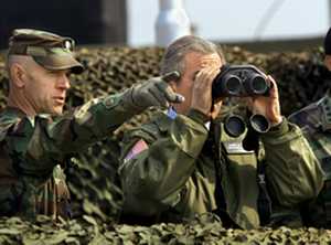布什視察都羅山車站 稱南北鐵路是和平之路(圖) 2002年02月20日 14:41 ![]() 布什在非軍事區(qū)用望遠鏡觀望朝鮮一側(美聯(lián)社) 中新網(wǎng)北京2月20日消息:韓國總統(tǒng)金大中和來訪的美國總統(tǒng)布什今天視察都羅山車站。這個車站是金大中希望連接平壤和漢城的鐵路線的北終點站。 據(jù)韓國聯(lián)合新聞社報道,金大中希望借此舉來敦促朝鮮對恢復對話的呼吁作出回應。 在上午的首腦會談中,兩國總統(tǒng)就聽取了這項連接南北的鐵路工程的進度情況簡報。 在舉行聯(lián)合記者招待會后,布什乘直升飛機花費二十分鐘抵達非軍事區(qū)。這個二點五英里寬,一百五十一英里長的區(qū)域布滿地雷,分界線兩側駐扎著將近朝韓兩百萬軍隊。 美國在韓國保持有三萬七千人的駐軍。布什在抵達時向一名指揮官威廉·米勒中校敬禮致意。 布什在都羅山車站發(fā)表講話。他說:“我們今天相聚在這里,周圍是朝鮮半島和平與穩(wěn)定受到挑戰(zhàn)時的遺跡。金大中總統(tǒng)剛才向我介紹了一條他修建的道路--一條和平之路。” 據(jù)路透社報道,布什敦促朝鮮對韓國開放邊境。他說:“這條鐵路可能將這塊分裂的土地兩側的人民帶到一起來。為了朝鮮半島全體人民的福祉,朝鮮應該完成它! 布什在非軍事區(qū)的講話強硬的措詞中也顯示出靈活性。他甚至在談及朝鮮時仍使用了“邪惡”這個字眼,但他同時也重申了朝鮮對話的建議。 在一個觀察哨所里,布什身穿一件手臂上繡有美國國旗的綠色軍用夾克,通過雙筒望遠鏡從壘著沙袋的地堡內觀察朝鮮一側。