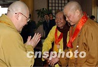 圖:兩岸佛教人士匯聚西安 2002年02月22日 09:30 ![]() 由臺(tái)灣佛教人士組成的法門(mén)寺佛指舍利赴臺(tái)灣地區(qū)瞻禮(供奉)恭迎團(tuán),日前乘專(zhuān)機(jī)抵達(dá)西安。圖為兩岸佛教人士相互施禮。中新社記者 錢(qián)興強(qiáng) 攝