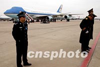 圖文:中國軍警在機場嚴密保衛(wèi)美“空軍一號” 2002年02月22日 18:45 ![]() 中國軍警二十二日在北京機場嚴密保衛(wèi)美國總統(tǒng)布什乘坐的空軍一號專機。中新社記者 賈國榮 攝