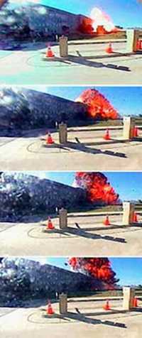 組圖:美國(guó)媒體公布飛機(jī)撞擊五角大樓瞬間照片 2002年03月08日 09:43 ![]() 五角大樓北面的監(jiān)視鏡頭拍攝的撞擊場(chǎng)面 中新網(wǎng)北京3月8日消息:美國(guó)傳媒公開(kāi)一組去年“九·一一”恐怖襲擊事件中,國(guó)防部所在的五角大樓遭被劫持客機(jī)撞擊瞬間的照片。 據(jù)美聯(lián)社報(bào)道,這組照片共有五幅,是由懸掛在五角大樓北面的一個(gè)監(jiān)視鏡頭拍攝的。從照片中看,五角大樓北側(cè)遭飛機(jī)撞擊時(shí),從地面騰起一團(tuán)火焰,并冒出滾滾濃煙。