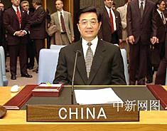 圖:胡錦濤在聯(lián)合國安理會做"五秒鐘代表" 2002年04月30日 08:44 ![]() 美國東部時間四月二十九日下午,中國國家副主席胡錦濤一行在首次對美國進行正式訪問期間,來到紐約聯(lián)合國總部參觀。在聯(lián)合國安理會會議廳中,胡錦濤坐到常任理事國中國的代表席上留影,并笑稱:“讓我當(dāng)個五秒鐘的代表吧!敝行律缬浾 陳建 攝