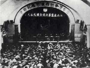圖文:中國(guó)共產(chǎn)黨第七次全國(guó)代表大會(huì)簡(jiǎn)介 2002年05月14日 17:10 ![]() 圖為七大會(huì)場(chǎng) 1945年4月23日至6月11日,中國(guó)共產(chǎn)黨第七次全國(guó)代表大會(huì)在延安楊家?guī)X中央大禮堂召開,歷時(shí)50天。出席大會(huì)的正式代表547名,候補(bǔ)代表208名,共計(jì)755名,代表全國(guó)121萬(wàn)黨員。大會(huì)選出毛澤東、朱德、劉少奇、周恩來(lái)、任弼時(shí)、林伯渠、彭德懷、康生、陳云、陳毅、賀龍、徐向前、高崗、張聞天、彭真15人組成主席團(tuán),選舉任弼時(shí)為大會(huì)秘書長(zhǎng)、李富春為副秘書長(zhǎng)。 大會(huì)的主要議程是:毛澤東作《論聯(lián)合政府》的政治報(bào)告;劉少奇作《關(guān)于修改黨的章程的報(bào)告》;朱德作《論解放區(qū)戰(zhàn)場(chǎng)》的軍事報(bào)告;周恩來(lái)作《論統(tǒng)一戰(zhàn)線》的報(bào)告;任弼時(shí)作關(guān)于黨的歷史問(wèn)題的報(bào)告;通過(guò)新的黨章,選舉新的中央委員會(huì)。6月9日,選舉中央委員會(huì)委員4 4名。6月1 0日,選舉中央委員會(huì)候補(bǔ)委員3 3名。6月1 1日,大會(huì)閉幕,毛澤東致題為《愚公移山》的閉幕詞。