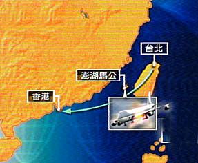 圖:臺灣墜海客機(jī)飛行路線示意圖 2002年05月25日 18:52 ![]() 鄭重聲明:關(guān)于臺灣華航飛機(jī)失事的新聞信息,系中新網(wǎng)特稿,未經(jīng)書面授權(quán),不得采用。
