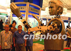 圖:國產(chǎn)音樂迎賓機器人亮相 2002年05月26日 11:02 ![]() 一位國產(chǎn)音樂迎賓機器人,在五月北京國際科技產(chǎn)業(yè)博覽會上亮相,它能指揮許多中外名曲向來賓致意。賈國榮 攝