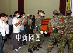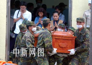 組圖:馬公空軍基地成華航遇難者身份辨認(rèn)中心 2002年05月26日 22:56 ![]()   部分失事華航客機(jī)遇難乘客遺體從澎湖空運(yùn)回臺(tái)灣島。5月26日傍晚,部分已經(jīng)確認(rèn)身份的失事華航客機(jī)遇難乘客尸體被巨型C130運(yùn)輸機(jī)運(yùn)回臺(tái)灣島。中新社傳真任晨鳴攝 ![]()   多數(shù)華航遇難乘客家屬選擇土葬。5月26日,臺(tái)灣澎湖馬公空軍基地成為搜索到的遇難乘客尸體辨認(rèn)中心。中新社傳真任晨鳴攝 ![]()   擺放在臺(tái)灣澎湖馬公空軍基地中的盛殮遇難者遺體的棺材。5月26日,臺(tái)灣澎湖馬公空軍基地中的遇難乘客尸體辨認(rèn)中心排列了眾多棺材。中新社傳真任晨鳴攝 ![]()   華航遇難乘客家屬送親人上靈車。5月26日下午,確認(rèn)了身份的華航遇難乘客尸體被家屬送上靈車。中新社傳真任晨鳴攝 ![]()   臺(tái)灣澎湖馬公空軍基地成為華航遇難乘客身份辨認(rèn)中心。一向門禁森嚴(yán)的臺(tái)灣澎湖馬公空軍基地,5月26日人流不息,成為華航遇難乘客的身份辨認(rèn)中心。中新社傳真任晨鳴攝 鄭重聲明:關(guān)于臺(tái)灣華航飛機(jī)失事的新聞信息,系中新網(wǎng)特稿,未經(jīng)書面授權(quán),不得采用。