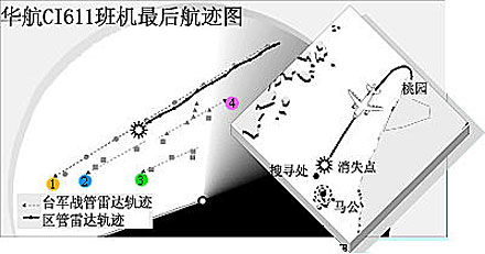 圖:"華航"失事客機(jī)雷達(dá)軌跡顯示高空解體情形 2002年05月27日 15:39 ![]() 臺(tái)灣“華航”CI611班機(jī)25日下午3時(shí)28分在馬公西北方10里、高度35000英尺處失事(左圖實(shí)線中止處),臺(tái)軍的戰(zhàn)管雷達(dá)當(dāng)時(shí)追蹤到四個(gè)區(qū)域有雷達(dá)反應(yīng)(圖中所標(biāo)的1、2、3、4處),其中三個(gè)光點(diǎn)朝西南方,約和飛機(jī)航行方向相同,另一光點(diǎn)(4號(hào))卻朝東北方向快速移動(dòng)。此軌跡顯示失事班機(jī)在高空解體,并至少裂成四大塊。(臺(tái)灣聯(lián)合報(bào)圖) 鄭重聲明:關(guān)于臺(tái)灣華航飛機(jī)失事的新聞信息,系中新網(wǎng)特稿,未經(jīng)書面授權(quán),不得采用。