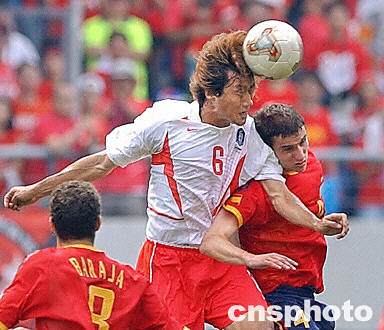 圖:西班牙VS韓國 柳相鐵飛身頂球 2002年06月22日 15:12 ![]() 6月22日韓日世界杯1/4決賽,西班牙隊VS韓國隊的比賽在韓國光州體育場進(jìn)行。目前場上比分為0:0。圖為韓國隊6號柳相鐵飛身頂球。