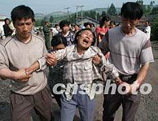 目擊:白山市江源縣“七·四”礦難大救援側記 2002年07月05日 16:03 ![]() 三十九名礦工被困井下生死不明,其家屬聞訊后悲痛欲絕。目前搶救工作正在緊張進行中。吳兆飛 攝 中新社白山七月五日電題:為了井下三十九名礦工兄弟 ——白山市江源縣“七·四”礦難大救援側記 作者 吳兆飛 祝子眾 程澤 記者趕到白山市江源“七·四”煤礦瓦斯爆炸事故現場已過中午,距事故發(fā)生已十幾小時,現場目睹了“七·四”礦難的緊張有序的救援工作。 發(fā)生事故的富強煤礦從一九九六年開始采煤。二OOO年三月四日中午十二時三十分,隨著瓦斯爆炸的轟隆巨響,二十一名礦工永遠告別了這個世界。而今天,又有三十九條生命在這里懸于一線。 富強煤礦東側有一個大煤堆,上面有纜繩、礦車等設備。主井坐落在煤礦兩側,這里聚集著四十多名礦工,正在緊急救援。在主井旁邊,記者看到四十多名工人分成三組:一組集中在塌方的坑道里,正在向外轉移塌下來的泥土、石塊、支柱和橫梁;一組聚集在坑道一側,將扔上來的泥沙運走;一組分散在四周,用礦車向外搬運塌方的泥石、木材等。 記者在現場看到悲痛萬分的礦工陳在先,他的二哥在此次礦難中被埋在下面。據陳介紹,他們來自四川簡陽農村,是他鼓動二哥一起到這里賺錢,本想有個照應,沒想到發(fā)生了礦難。他聽到爆炸聲,拼命從住處跑到發(fā)生礦難的井口,當時井口還冒著煙。他邊流淚邊拼命地用手挖土,向外搬石塊!爱敃r我沒有感到一點疼痛!辈痪么蠹叶稼s來救援。 在井口,記者看到救援人員的臉被煤灰染黑。因為天氣悶熱,很快汗水成泥淌了下來,不時迷住雙眼,他們就用袖子擦一下,繼續(xù)揮鍬清理……據一位剛換下來的救援礦工說,“我們礦工在一起很長時間了。一日不見,他們就被埋在地下,那可是三十多個兄弟呀!我們不管付出多大代價也要把他們找到! 據悉,事故發(fā)生后,造成主井口部位十多米的泥石塌方,將井口覆蓋,要想救援,先要清除這里的塌方物。主井東側還有一個副井,此時風扇已經打開,緊急向外排放瓦斯氣體,坑道有三百多米長,救援的工作人員從副井進去以后,走了大約五十延長米,發(fā)現前方塌方嚴重,再進入很可能發(fā)生不測,于是撤出來商量救援對策。 與井口挖掘搶險工作同時進行的副井口疏通排氣工作也在緊張進行,緊急排放瓦斯爆炸后產生的有毒氣體,并有可能在此井口實施搶救。當記者離開現場時,副井口周圍由于排出的有害氣體的積聚,為了安全,現場已開始疏散除搶救人員以外的工作人員,并嚴禁攝像、拍照、打手機等一切可誘發(fā)再次爆炸的不安全舉動。 事故發(fā)生后,吉林省副省長李介車帶領白山市、江源縣有關官員迅速趕赴現場,下到坑道里進行巡視,征求有關專家意見后擬定了初步搶險方案 目前,事故搶險工作正在緊張有序地進行,礦區(qū)社會狀況平穩(wěn)。(完)