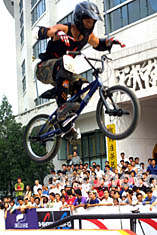 圖:中國極限精英賽街市決賽 2002年08月12日 16:30 ![]() 北京選手于秒在八月北京舉行的中國極限精英賽街市決賽中,高空雙手撒把體現(xiàn)了極限運(yùn)動(dòng)的驚險(xiǎn)刺激。作者:史利