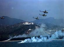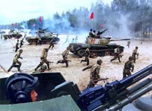 解放軍東海聯(lián)合演練 高科技與實戰(zhàn)融為一體(圖) 2002年08月19日 08:32 ![]() 步坦協(xié)同,席卷敵陣 ![]() 戰(zhàn)鷹突破空中防線 ![]() 獵潛艇劈波斬浪 ![]() 直升機臨空支援 中新網(wǎng)北京8月19日消息:中國官方媒體人民網(wǎng)昨晚發(fā)表解放軍在東海演習(xí)的照片,從照片中可以看到演習(xí)動用了坦克、軍艦、戰(zhàn)機和直升機。 據(jù)人民網(wǎng)報道,東海某海域進(jìn)行三軍聯(lián)合作戰(zhàn)演習(xí)的南京軍區(qū)隊及配屬的?哲婈,把現(xiàn)代高科技與未來實戰(zhàn)需要融為一體,為全面掌握現(xiàn)代戰(zhàn)爭的特點和主動權(quán)﹑制勝權(quán)。 報道指,三軍將士以飽滿的熱情真打真練,能謀善戰(zhàn),斗志高昂,樹立了敢打必勝的信心。