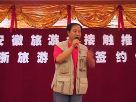仍然是一件紅色的T恤,外套一件乳白色的攝影小褂,牛群有點感冒,但是依舊神采飛揚。他靜悄悄地出現(xiàn)在了今天此間召開的“安徽省旅游精品推薦會”上,直到安徽省旅游局局長高蔚青將他請上請到前臺,他才成為眾人的焦點,并謀殺了不少記者的菲林和鏡頭!皝喼捱@小地方,怎能跟杭州比?”一段小幽默后,牛群開始演唱自己填詞,借用別人曲調(diào)的《杭州雄風(fēng)》。“······我們杭州,河像熱血流,(旁白:有大運河、錢塘江)······我們杭州,姑娘美,小伙更風(fēng)流!”一首優(yōu)美的曲調(diào),首先將東道主捧得心花怒放?磥怼芭8纭钡耐其N手法實在是高明。