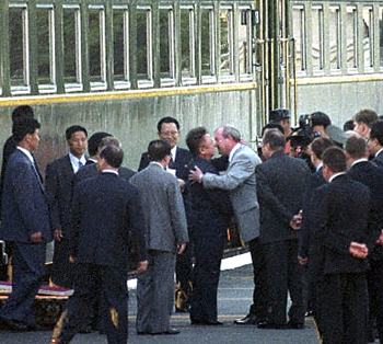 陪同金正日訪問(wèn)的有朝鮮人民軍總參謀長(zhǎng)金永春、國(guó)防委員延亨默、勞動(dòng)黨中央書記金容淳、外務(wù)省第一副外相姜錫柱、國(guó)家計(jì)劃委員會(huì)委員長(zhǎng)樸南基、鐵道相金勇三等。