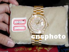 圖為起拍價為五萬七千四百元的“勞力士”手表,據(jù)拍賣行介紹,該表表芯為原裝,“滿天星”表面是后來鑲嵌上的。