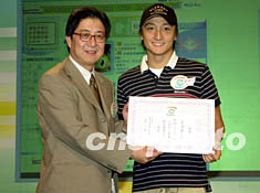 歌星方力申9月5日出席香港電臺(tái)聯(lián)同教育署舉行「教育電視2002-2003新學(xué)年啟播典禮」。助理廣播處長張文新向方力申致送邀請(qǐng)狀,邀請(qǐng)他參與演出教育電視節(jié)目。鄧慶樂 攝