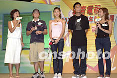 四位樂壇年青歌手方力申、李彩樺、余文樂、方皓玟(左二起)9月5日出席香港電臺(tái)聯(lián)同教育署舉行的「教育電視2002-2003新學(xué)年啟播典禮」。他們將有機(jī)會(huì)參與演出教育電視節(jié)目,教育電視節(jié)目將于9月9日起正式啟播。鄧慶樂 攝