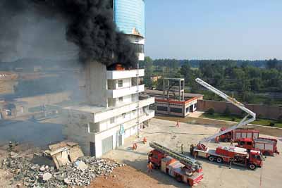 “砰!”5顆紅色信號彈躥上天空,9層高的大樓內(nèi)隨之發(fā)出一聲巨響,大樓北側(cè)的兩層附樓轟然倒塌,一股濃煙夾雜著火焰從5樓窗口躥出。大樓內(nèi)的人們紛紛跑到窗邊呼救。