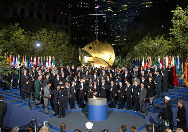 罹難者人數最多的紐約世貿廢墟是今天全美紀念活動的中心,數以萬計的人今天早晨聚集在這里聆聽每一位罹難者的名字,沿著長長的斜坡走進七層樓深的世貿廢墟中為他們獻花。當暮色降臨的時候,距離世貿廢墟不遠的炮臺公園點燃了一簇火焰,聯合國秘書長安南、美國國務卿鮑威爾、紐約市長布隆博格以及中國外長唐家璇等來自罹難者家鄉(xiāng)的代表一起舉起點燃的蠟燭,悼念死難者。與此同時,紐約的五個行政區(qū)的公園里也聚集了眾多的市民,搖曳的燭光寄托著對逝者的思念。