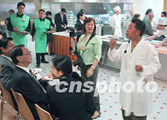 國際知名廚師、美國電視烹飪節(jié)目“甄能煮”主持人甄文達(右),九月十二日在“香港中華廚藝學院”,向三十多個美國游客介紹中華廚藝。中新社圖 張淑琴 攝