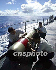 中國海軍環(huán)球航行訪問艦艇編隊九月二十日已滿載各國人民和軍隊的友誼,返航到祖國領海,經(jīng)各系統(tǒng)全面檢查、檢驗證實,艦艇機械、武器裝備和艦容均處于良好狀態(tài)。圖為水兵對水中兵器進行檢測保養(yǎng)。王松岐 攝