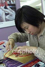 “匯豐中華慈善殘疾兒童藝術(shù)展”二十四日在北京開幕,來自培智學校的殘疾孩子在現(xiàn)場表演“中國結(jié)”的制作。作者:滿會喬