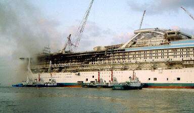 火災(zāi)發(fā)生在昨日下午六時(shí)左右。正在進(jìn)行內(nèi)裝修的“鉆石公主”號(hào)五層甲板首先起火,由于船內(nèi)尚未配置消防設(shè)備,未受控制的火勢(shì)迅速向上蔓延,濃煙翻滾。正在船內(nèi)施工的近千名工人聽到警報(bào)后迅速撤出,無人受傷。