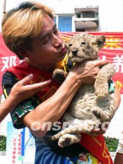 十九日中午,參加第十三屆全國書市的“影視大鱷"”鄧建國來到福州國家森林公園,,將上午在中亭街簽名售書所得款全部捐給國內(nèi)僅有的一只虎獅獸“花花”,同時認養(yǎng)“花花”。作者:楊婀娜