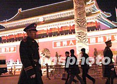 兩位武警戰(zhàn)士一日晚在天安門前值勤。北京加強安全保衛(wèi)工作,確保中國共產(chǎn)黨第十六次全國代表大會順利召開。作者:武仲林
