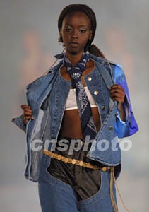 黑人模特展示美國設(shè)計(jì)師唐克蘭朵·迪斯利蒲的性感個(gè)性牛仔裝。